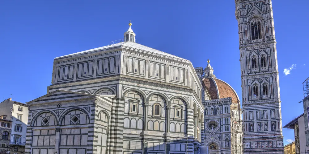 聖若望洗禮堂是聖母百花聖殿所轄的洗禮用教堂,在正南、正北和正東三面留有出入口,其餘五面封閉。其中東大門的浮雕鑲板全部鍍金,由洛倫佐·吉貝爾蒂設計鑄造,被米開朗琪羅稱為“天堂之門”,值得一看。洗禮堂是佛羅倫薩現存非常古老的建築,在11世紀祝聖啟用。其建築造型模仿拉特朗聖若望大殿的洗禮堂,為正八稜柱,正西側加建有高度略低的附屬用房。其建築風格屬於羅曼式,但具體建造時間存疑,一説為1059年到1128年。