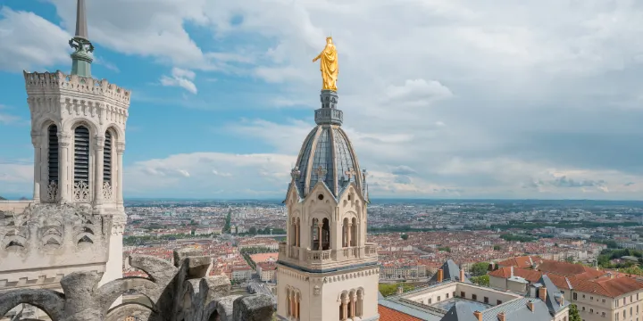 富維耶聖母院聳立於里昂索恩河西岸的山腰上,遠遠望去,白色的聖母教堂、拜佔廷風格的古堡塔樓和雉堞,與直直的裝飾尖頂、金色的聖母瑪麗亞塑像交相輝映。教堂建於1896年,原址是羅馬人的一個廣場,在普法戰爭時期,里昂人民為祈求戰爭勝利在此修建了聖母教堂。
