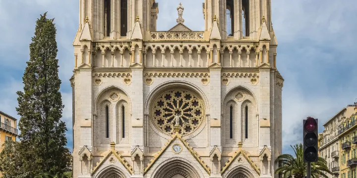 尼斯聖母院是尼斯最大的基督教堂,與巴黎聖母院的外觀十分近似。教堂外觀華麗,鑲有金邊的外牆和雕塑以及高65米的方形雙塔是其最醒目的標誌。教堂的彩色玫瑰窗講述了聖母瑪利亞升天的故事。