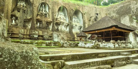 - 4.1分距離市中心20.5公里卡威山位於聖泉寺往南走一點點的地方,可以連聖泉寺一同遊覽。它是峇里島非常古老也是較大的遺跡,非常值得一看。卡威山是一個印度教廟宇羣,建於11世紀。11世紀國王AnakWungsu選擇這裏修建冥思石窟,國王死後,後人為他及家人建了十幾座佛教石龕。建築風格實際也和聖泉寺很像,衹是這裏的遊客比聖泉寺更少,更加安靜。周邊的自然環境非常美麗,並沒有被過渡開放,茂密的古樹、翠綠的梯田、迎風搖曳的椰樹,層層的小瀑布構成美好的畫卷,來看看自然風光也是不錯的。