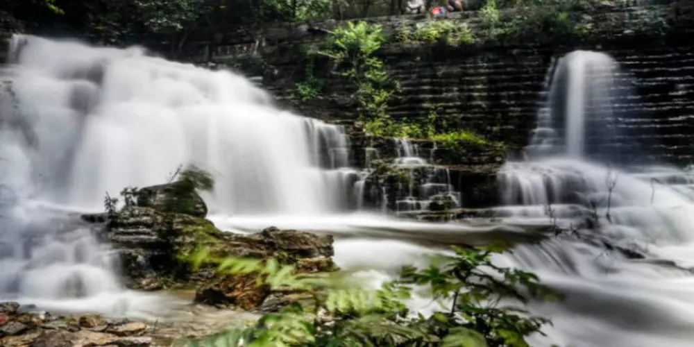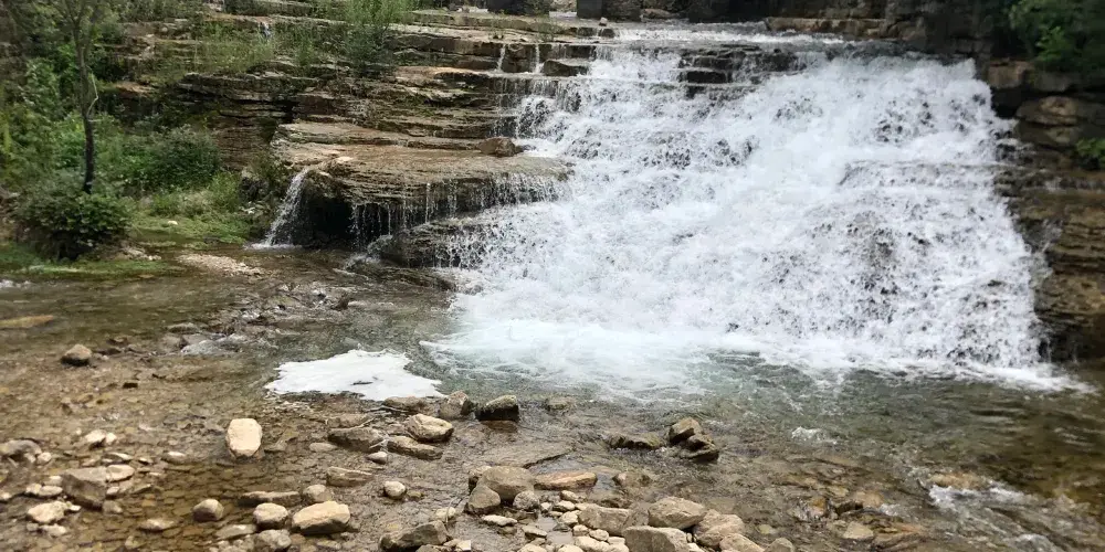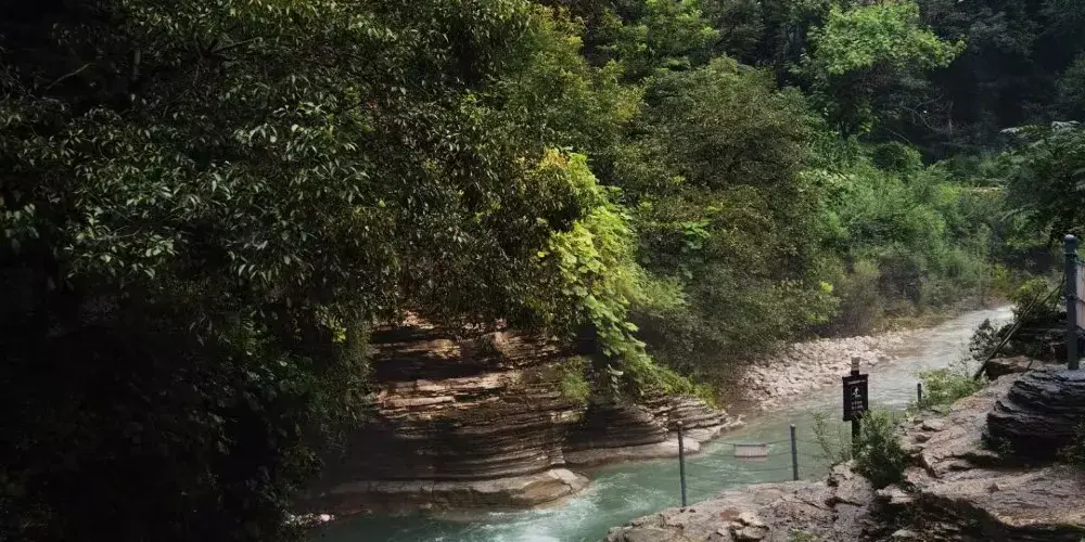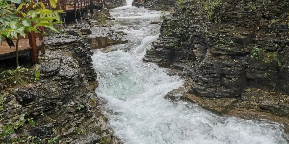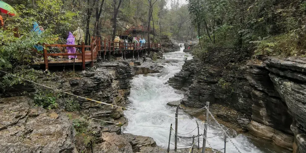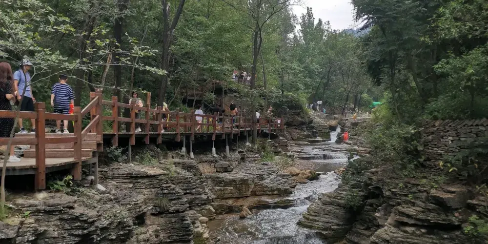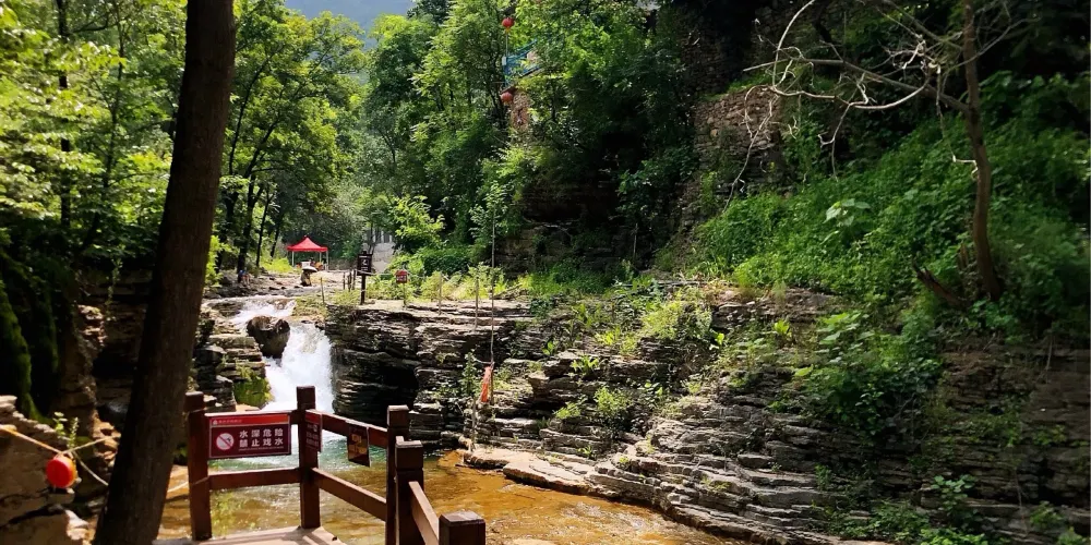 黃花溪位於國家級風景名勝區青州市,這裡景色優美,被眾多遊客稱為“北方九寨溝”。在山水交映、澗谷幽深中,還有崖壁飛瀑,給你不一樣的驚艷。穿過一處古色古香的連廊,你會來到一座吊橋前,盡頭有一個兩層重簷亭閣,在這裡你可以眺望三瀑合流的美景。踩著石頭過河,或者乾脆在河中間的石頭上坐下,接觸這山間水,感受來自大自然的清涼。