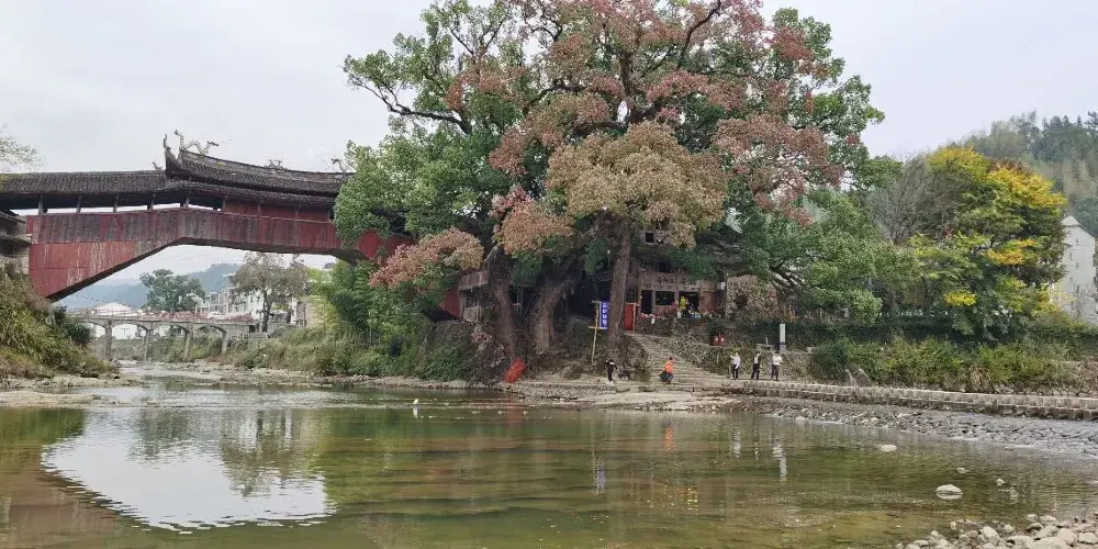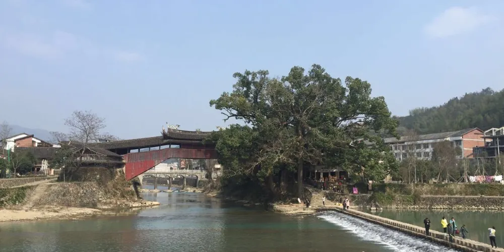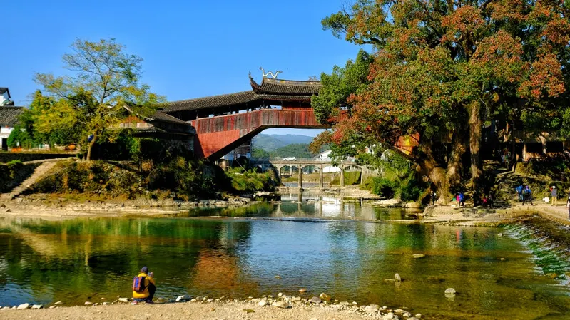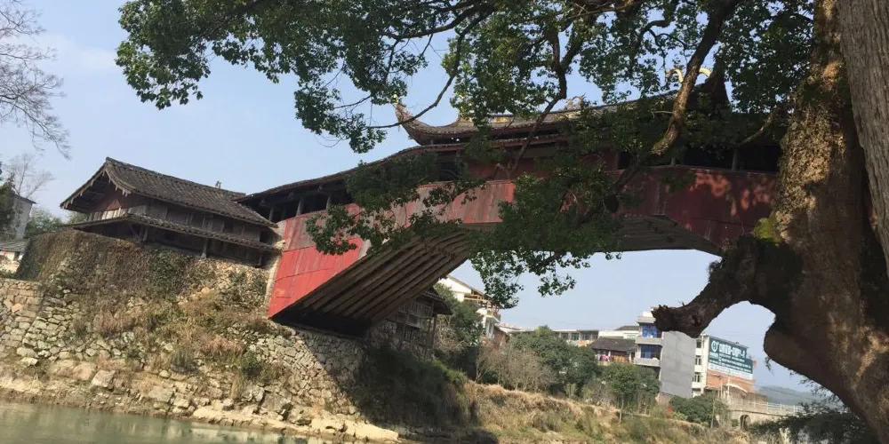 則評價溪東橋位於泗溪鎮,因橫跨鎮內東溪之上而得名。此橋建於明隆慶四年(1570),清乾隆十年(1745)重表,道光七年重修。整個橋長41.7米,寬4.86米,高10.35米,橋屋15間,中央三間是宮殿式主樓,構架飛檐翹角。橋棟上麪塑造“螯魚雙吐水”,棟下塑造“唐僧取經”及梅、蘭、竹、菊等諸多工藝,形態栩栩如生。橋頭飛挑,頗有吞雲吐霧之勢。橋面檐下,三間藻井,構造工藝精緻古樸,使橋身顯得更加秀麗堂皇。橋下溪水清澈,橋的另一側是一抹遠山,近處有兩座高山,獅子縫與將軍峯。據當地人講,此橋與其周圍環境形成了“將軍逗獅”的風水模式。紅色的橋身映襯在青山碧水中,更顯輕靈秀美。