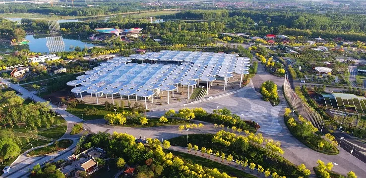 大部分展館置於梯田之下,利用梯田大型覆土建築結構的保濕隔熱性能,降低建築物採暖降溫能耗。屋頂設置雨水收集系統,場地採用透水鋪裝,地下設雨水調蓄池,經回收處理後的雨水將用於梯田灌溉,形成生態微迴圈。場館利用地道風的理論實現新鮮空氣的夏季預冷,冬季預熱,有效降低空調系統能耗。中國館的鋼結構屋蓋安裝有1024塊光伏玻璃,光能吸收效率更高,可以更好地適應建築的形態走勢。