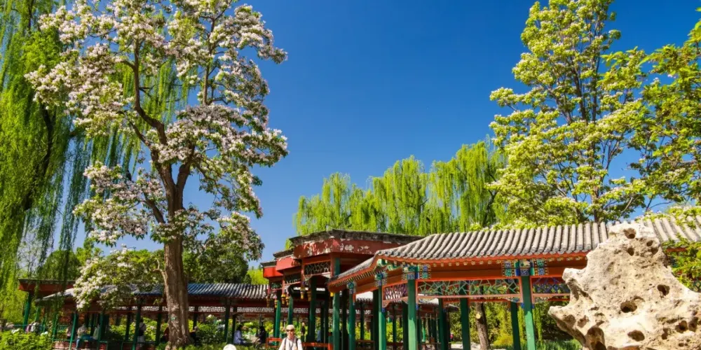 「讓我們蕩起雙槳,小船兒推開波浪…」,這首耳熟能詳的歌謠描繪的正是此處。北海位於故宮博物院西北側,與「中海」、「南海」合稱三海。公園曾是皇家園林,園內亭台錯落有致,湖畔林木鬱鬱蔥蔥,風光如畫。