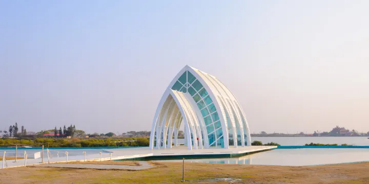 台南北門的水晶教堂,是雲嘉南風景區管理處為營造婚紗場景築建。以鹽田濕地為背景,北門水晶教堂周邊並巧搭淺水池,就為讓遊人得以欣賞晴空下教堂與倒影輝映美景。水晶教堂,參考澳洲雪梨歌劇院、關島海之教會St.LagunaChapel的水晶教堂意象並加以整合,委請設計師設計施工,造價約1300多萬新台幣。目前園區內,多數造景設施及愛情冰館、愛幸福咖啡館、浪漫的水晶教堂等主題多已完成,另一大特色鹽晶教堂,也於10月中旬完成。