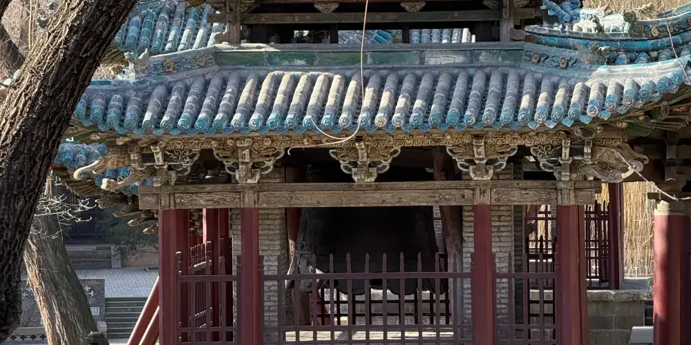 太原晉祠景區對越坊兩側分峙鐘鼓樓,如坊之雙翼,使對越坊顯得更加穩重雄偉。鐘鼓兩樓建於明萬曆三十四年(1606年),兩樓形制相同,下為邊長約7米的方形石砌基址,高約3米,設有台階可上下,台基上有12根廊柱,柱間置木柵,樓頂為重檐十字歇山頂,上飾彩色琉璃瓦。