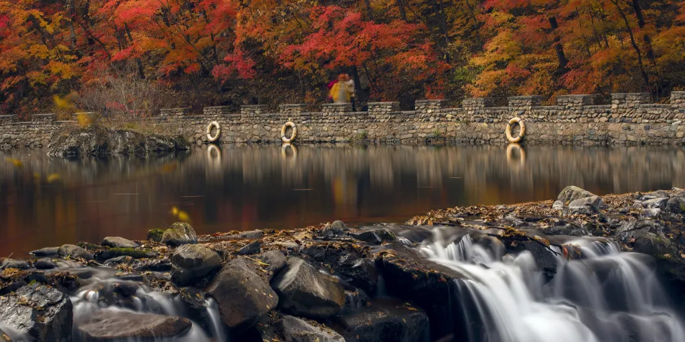 以湖為中心建立的本溪湖公園以小巧精緻見長,可觀賞性非常強。從公園右側拾級而上,山路陡峭,風景恰人。一面是懸崖峭壁,一面是青松、翠柏、草地青青。登及山頂,有涼亭供遊人歇息、乘涼,放眼望去,溪湖美景盡收眼底。