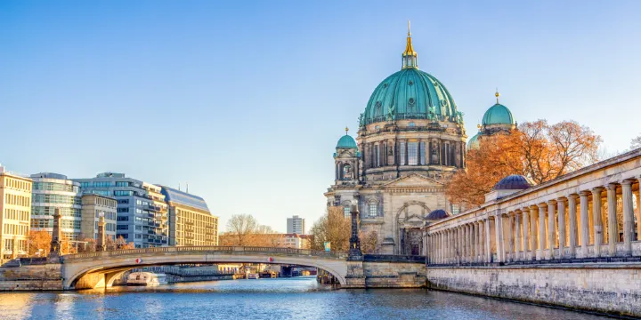 柏林大教堂坐落於柏林市區博物館島的東側,背靠施普雷河,它曾是霍亨索倫皇族的教堂,其家族成員都埋葬在這裡的地下室中。柏林大教堂在二戰中曾遭毀壞,修葺工作持續至今,但它依然是柏林搶眼的地標性建築,素有“博物館島入口之稱”。三座巴洛克的大圓頂氣勢非凡,面向施普雷河的四層建築採用了巴洛克宮殿的裝飾風格,金碧輝煌;西側的鐘樓服役至今,禱告的鐘聲悠遠綿長;爬過台階便可在大教堂頂端欣賞柏林市區的壯麗景色。