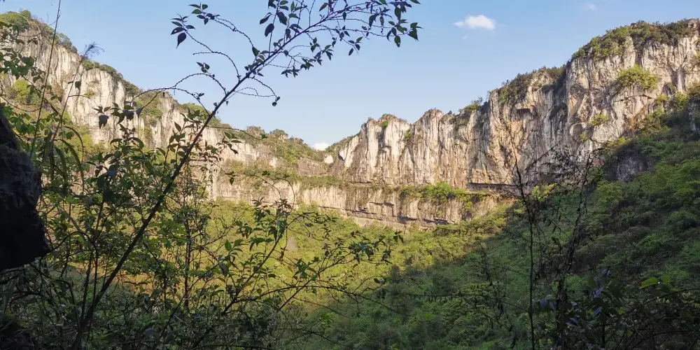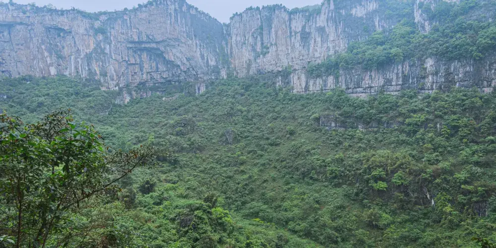 大漏斗長徑650米,短徑490米,深208米,大漏斗氣勢雄偉、深盆暗底、翠竹綠樹、怪石林立、坐盆觀天、圓天遙遙。
