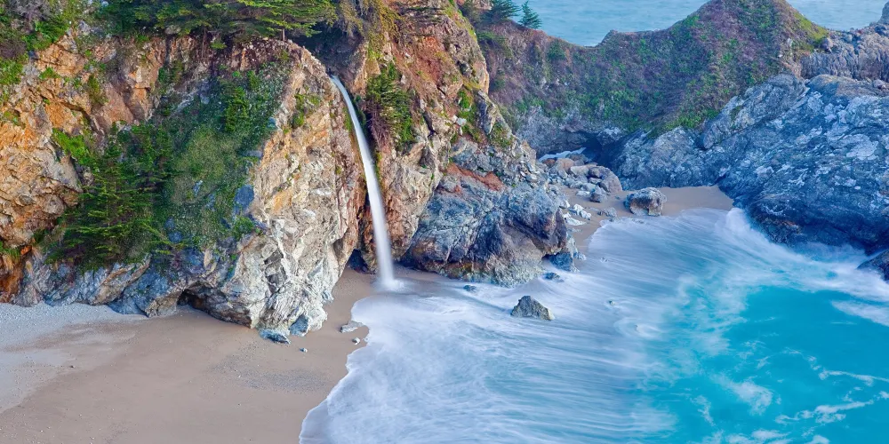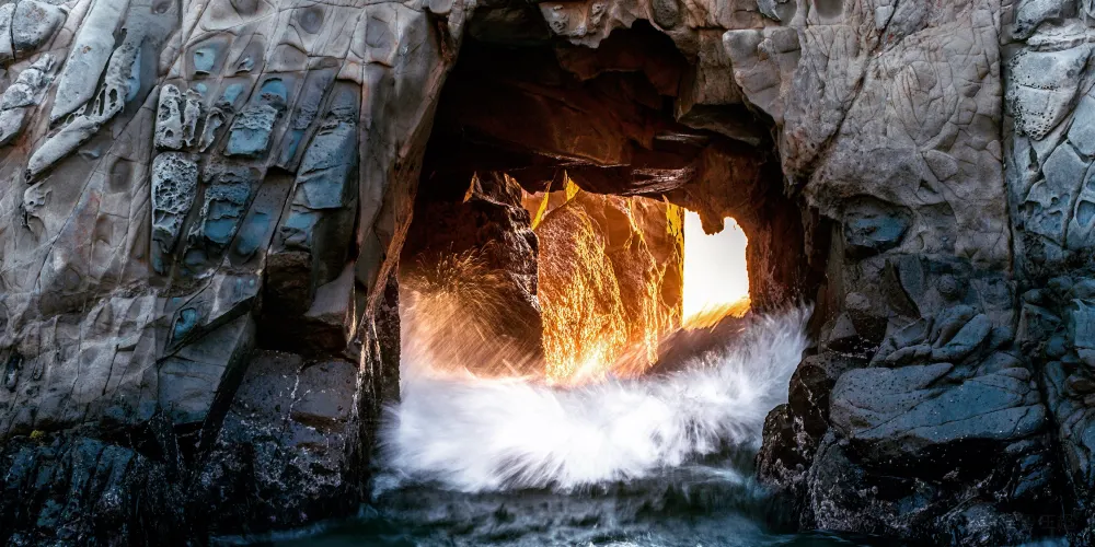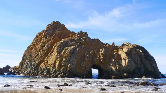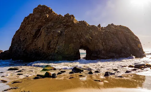 Pfeiffer Beach位於加利福尼亞州的一號公路沿岸,是當地最受歡迎的沙灘之一。這裡是世界上獨一無二的紫色沙灘。劇烈的風化作用使得錳含量很高的山石瓦解成沙子散落在沙灘上,使得沙灘呈現深紫色,十分浪漫。從海灘入口進入,你會看到一座門型的礁石,中心處有個空洞,透過洞可以看到海平面,海水不斷地湧入,也是非常有特色。