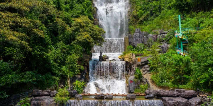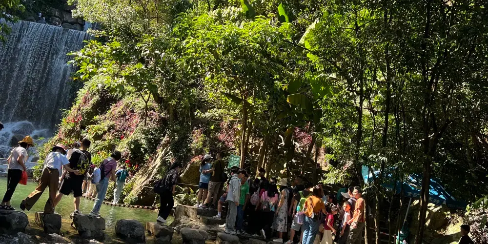 在幽美的竹林裏嬉戲,到壯觀的天梯上眺望,漫閲湖光十色的青龍湖,觀賞到湖心彩閣和九重飛瀑的壯麗景觀,沿着泉水的潺潺水聲進入千谷溪叢林探險,兩岸青山相映,溪水蕩漾着笑渦,陡峭的巖壁旁山幽鳥鳴、百雀飛舞。溯溪而上有眾多的體驗項目供遊客參與:浮橋、洞天九曲橋、山溪浮艇、深山飛躍、驚心鐵絲橋、飛躍銀河等等,都充滿了挑戰與感覺。清澈見底的流動水晶泉,萬木葱蘢的原始森林、玲琅滿目的奇花異果,四處都充斥着原生態的味道,是天然的氧吧和武俠仙境。在千谷溪雨林山溪中溯游探險,遊客可盡情享受大自然魅力,沐浴令人心曠神怡的森林浴。