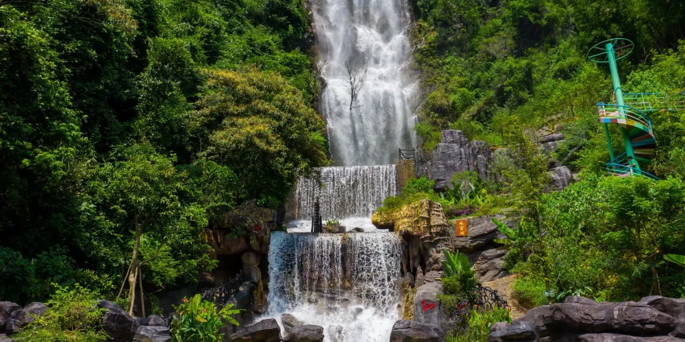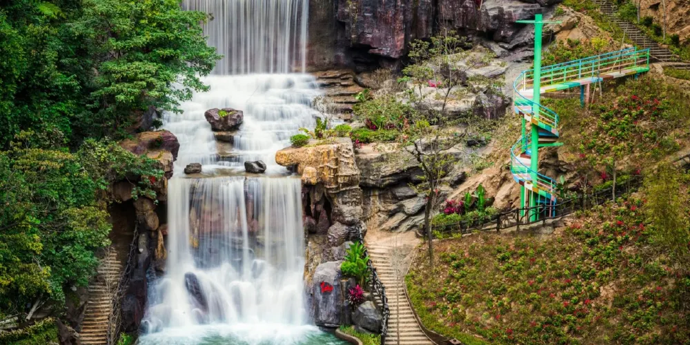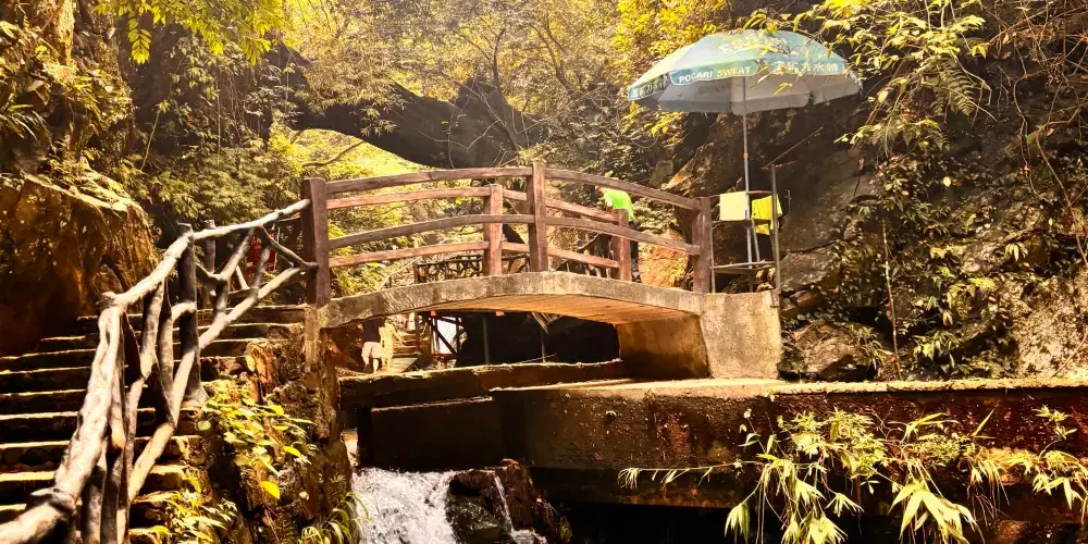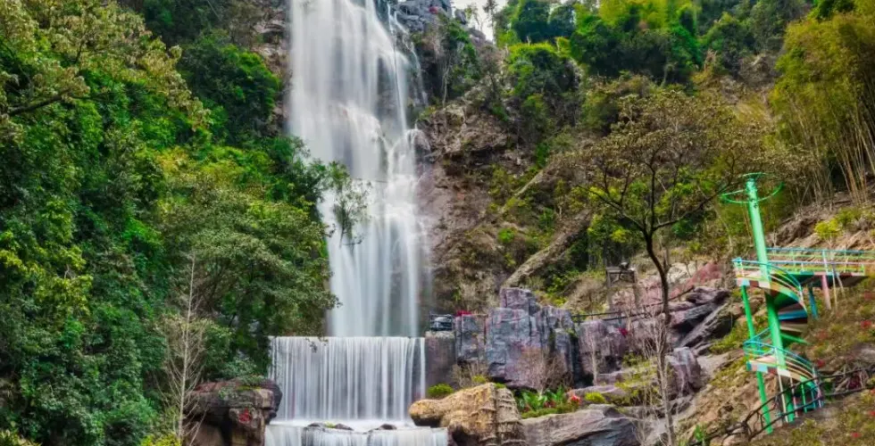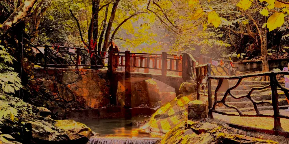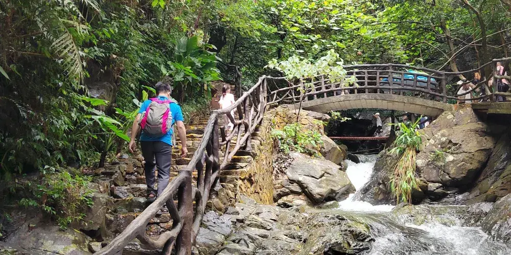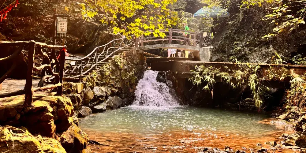 在幽美的竹林裡嬉戲,到壯觀的天梯上眺望,漫閱湖光十色的青龍湖,觀賞到湖心彩閣和九重飛瀑的壯麗景觀,沿著泉水的潺潺水聲進入千谷溪叢林探險,兩岸青山相映,溪水盪漾著笑渦,陡峭的岩壁旁山幽鳥鳴、百雀飛舞。溯溪而上有眾多的體驗項目供遊客參與:浮橋、洞天九曲橋、山溪浮艇、深山飛躍、驚心鐵絲橋、飛躍銀河等等,都充滿了挑戰與感覺。清澈見底的流動水晶泉,萬木蔥蘢的原始森林、玲瓏滿目的奇花異果,四處都充斥著原生態的味道,是天然的氧吧和武俠仙境。在千谷溪雨林山溪中溯游探險,遊客可盡情享受大自然魅力,沐浴令人心曠神怡的森林浴。