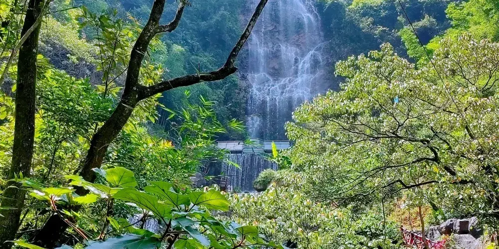九重飛瀑高208米,是筆架山脈少有的高空奇瀑,巨大的水幕如銀河飄雪從山峰中飛泻層疊而下,氣勢磅礴,很壯觀。「香爐瀑布遙相望,回崖沓嶂凌蒼蒼」,瀑布兩側峻崖環繞,峰巒重疊,猶如世外桃源一般屹立於此。