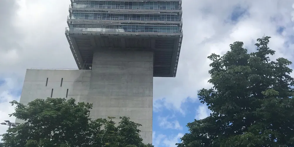 在南側主入口處,博物館建築從城市高架橋下穿過,與建在橋另一面的高塔一起環抱高架橋,使得建築與城市融為一體。