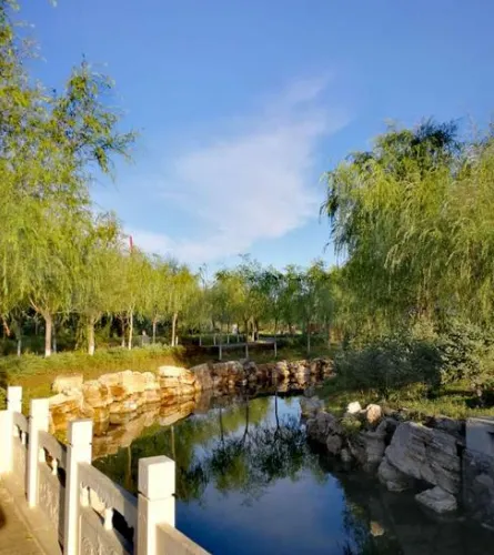濱河公園佔地面積三百多畝,樹木葱鬱,亭台樓榭,景色優美。園內有一個小湖,湖中有生態綠島,設有環形棧道和遊船碼頭。