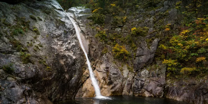 飛龍瀑布位於雪嶽山國立公園內,水聲震耳欲聾,因其外形如巨龍騰空躍起而得名。通往飛龍瀑布的小路穿梭於松林間,適於徒步。千佛洞溪穀下遊的雙川有座飛龍橋,過橋左行30分鐘,便到由6處瀑布和深潭連成的六潭瀑布。