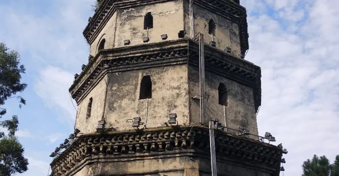 黑塔又稱七星山塔,於明嘉靖年間(1522-1566年)所建,是東山白塔的一對兄弟塔(兩塔隔長江相望),在市南郊南廣鎮塔壩村七星山的一個山峯上,距市區十公里。黑塔塔身為空心密檐八方園錐形磚石結構。台基為須彌座,高1.7米,每邊長4.4米,通高30.7米。塔身為八角形,塔頂早塌,現存七層。塔內有空室,置佛龕,多浮雕石刻,有蹬道盤旋而上。塔身逐層內收,第七層座檐上為暗層塔頂。塔內有實心柱,每至一層都有龕室。塔內踏道頂用磚相對疊澀作卷形頂,踏級繞實心柱由左至右盤旋至頂。計118級。塔西向,大門高2.2米,高1.15米,門柱園形,兩側刻圓弧形“龍柱”,底層藻井刻“二龍搶寶”。第四層藻井刻“雙鳳朝陽”,第七層藻井刻“盤龍”,圖案。這些雕刻精細,形態逼真。整個塔身用鐵青色磚石砌成,未敷塗料,加之多年沒進行過維修粉飾,遠觀如黛,“黑塔”之名由此而得。
