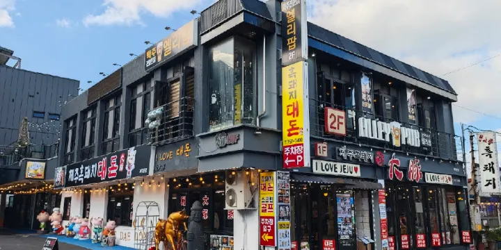 來濟州島,黑豬肉就成了必嚐的美食。黑豬肉一條街其實不長,南北縱橫一條五十來米長的街,街邊兩側集聚著以黑豬肉為主打的烤肉店,這條美食街是愛吃烤肉的遊客不可錯過的美食集聚地。不過較火的,人氣較旺的就是街口左邊的一家“豚”,店面挺大的,晚上7點多去還得排隊。