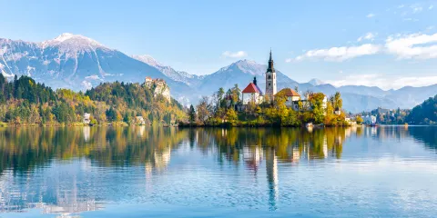 布萊德湖是斯洛維尼亞知名的湖泊,大約在一萬多年前由阿爾卑斯山脈的冰川地質移動而形成,所以有“冰湖”之稱。這裡四周是高山,中間是湖,景色如同仙境一般,湖中的教堂彷彿海市蜃樓,非常美妙。