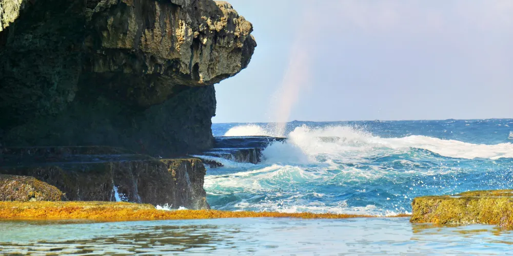 在天寧島的東南端,有種被列為世界五大奇景之一的噴水海岸。所謂噴水海岸,就是火山熔岩形成的礁石下有一些不規則的洞穴,當潮水扑打過來時,這些洞穴會象鯨魚似的噴出水來。壯觀的時刻,噴水的高度可達到20英尺。