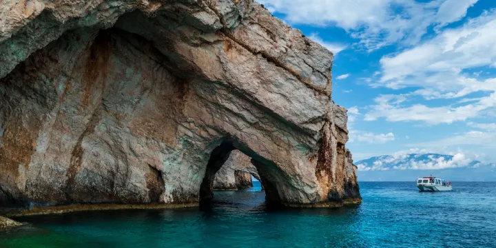 藍洞不是單獨一個洞穴,而是沿海岸線一排天然形成的溶洞,是島上知名的景點之一。這些藍色洞穴位於扎金索斯島北部東岸,洞內的海水十分透亮,像水晶一樣發著幽幽的光芒,令人心醉。晶瑩剔透的海水映入眼簾,猶如藍色墨水被打翻一般,非常驚奇。扎金索斯島上有很多遊覽藍洞的玻璃船,乘坐遊船來此,透過玻璃船底部可以看到清楚地海底的熒光藍色細沙和浮游生物。天氣炎熱的夏天,還可以下海暢遊一番,整個身體都會被折射為熒光藍,着實令人驚歎。