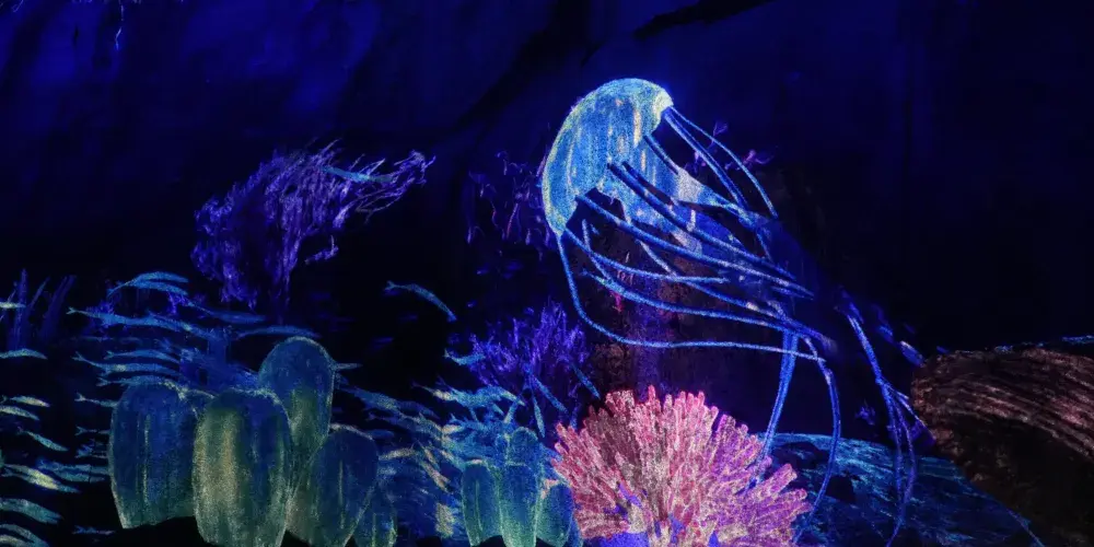 藍眼淚奇幻主題公園打造了16項沉浸式互動體驗,運用十多種人工智能行為捕捉技術構建場景,透過真人NPC輔助,以達到與觀眾實時互動的沉浸式體驗效果。探秘者可透過雷達互動系統實現與系統的非觸控式互動,LED裸眼3D表現形式更添真實感和沉浸感,高清的全景投影互動系統能將內容呈現在觀眾周圍的環境中,形成全方位的虛擬場景填充,逼真的三維效果配合投影MAPPING。遊覽過程中,探秘者不止是遊覽過程中,探秘者不只是獲得視覺、嗅覺、聽覺的享受,更有真實的觸覺體驗,讓觀眾完全融入這場夢幻的海底森林環境中,深刻體驗森海光影互動。