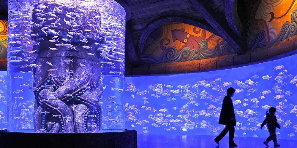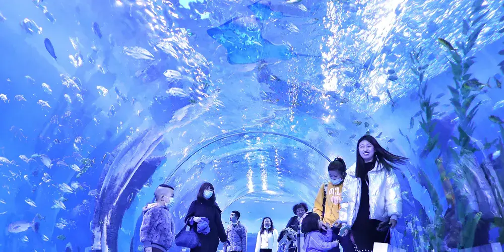神秘幽靜的海底世界,無需厚重的潛水裝備,漫步於超長的全景透明水下觀光隧道,直達海底最深處。遮天蔽日的鯊魚,憨態可掬的海龜,近萬尾五彩斑斕的海水魚在「身旁」游過,海底深邃而迷人,神秘而絢麗。