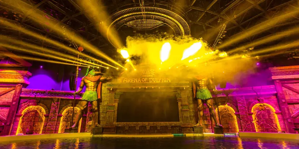 海神的「聖獸之家」,重現古羅馬地標性建築圓形競技場,場內「聖獸」海豚如「角鬥士」般以高難度技巧及整齊動作,施展渾身解數,征服現場每位觀眾。精靈般的空中舞者在夢幻唯美燈光下,融合多種藝術形式與多重情感體驗,呈獻一場穿越時空的視覺盛宴。