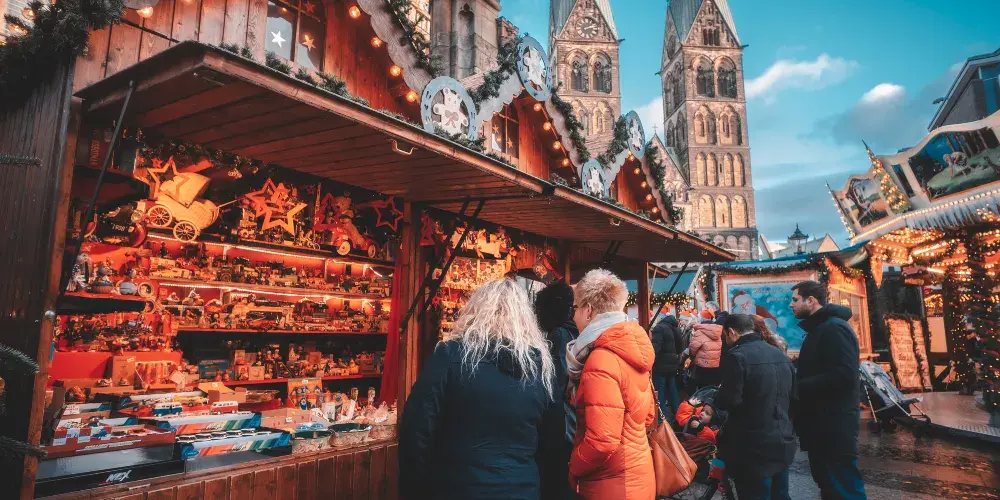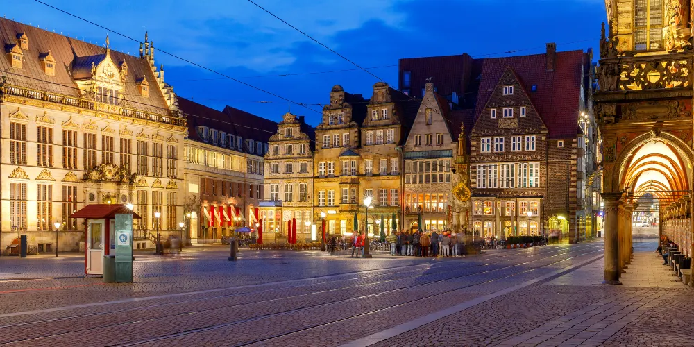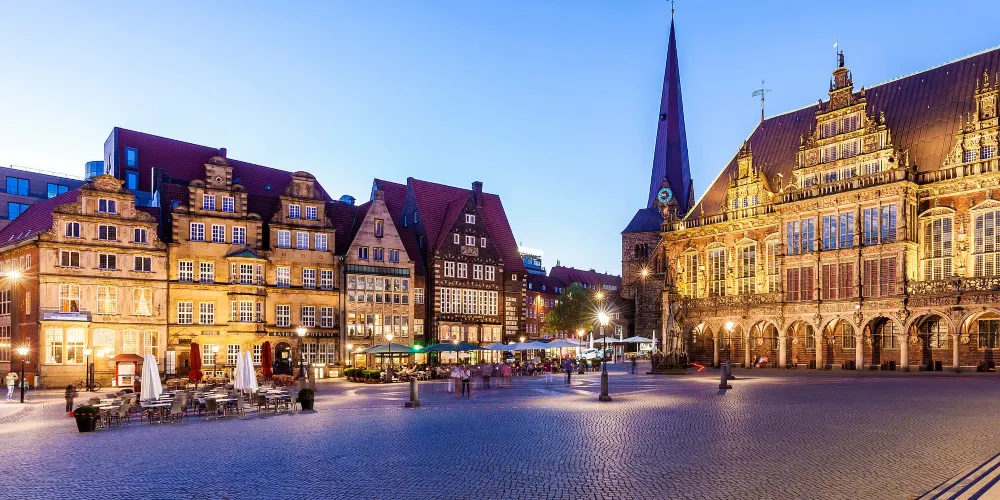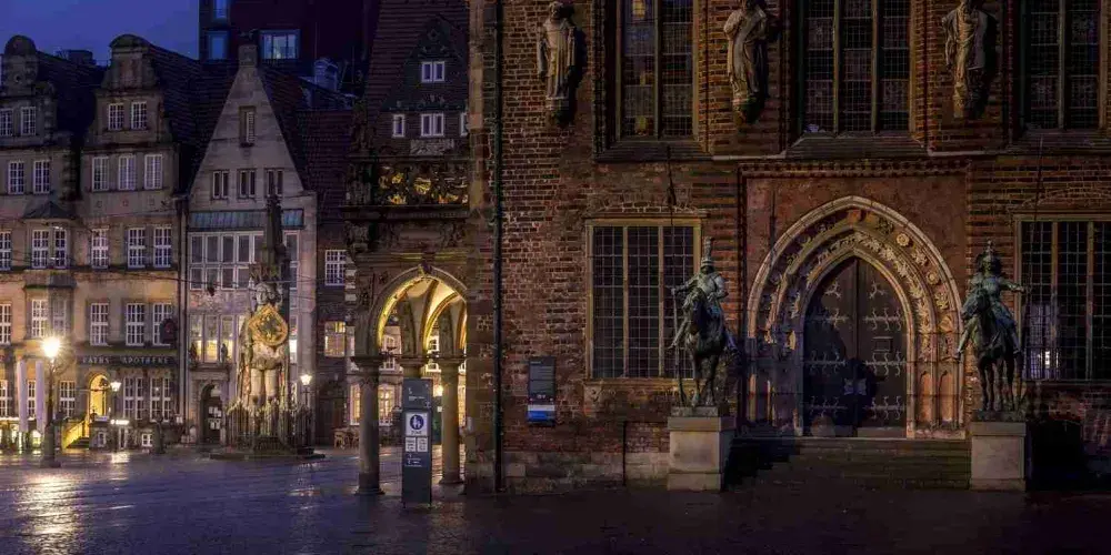 不來梅市場廣場以中世紀建築群為核心。廣場北側矗立著600餘年歷史的市政廳,哥德式立面融合文藝復興裝飾,內部壁畫與木雕保存完好。其前方8.5公尺高的羅蘭雕像象徵城市自由,為歐洲同類雕像中頗具代表性之一。廣場西側為聖彼得利大教堂,雙塔尖頂與青銅穹頂形成鮮明對比,每週會有鐘琴演奏吸引遊客駐足。東側的施廷酒店現為商會駐地,文藝復興風格山牆與金色浮雕展現歷史底蘊。不來梅市中心的市政廳和羅蘭像於2014年一起被聯合國教科文組織列為世界文化遺產。