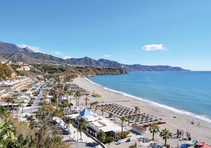 布麗亞納海灘位於西班牙內爾哈,這裏擁有湛藍的天空,清澈的海水,還有綿長的海岸線,遊客可以在躺椅上一邊吹海風,一邊欣賞海景。