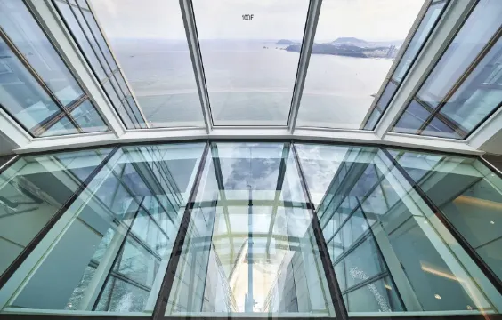 △俯視透明玻璃地板下的海雲台白色沙灘和大海,感受流經全身的快感。
