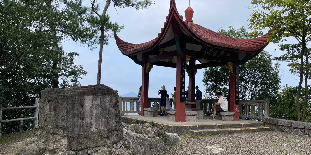 步虛亭,立於鼎湖峯身後的步虛山巔。據人説建亭時,曾挖出石硯、石筆。步虛亭,是觀覽仙山勝景的較佳之處。向西鼎湖在下,古麗在上,中間筍川、前湖諸村,歷歷在目,似乎置身於天宮仙府,有天地之隔。而鼎湖峯,從地底深處森然隆起,狀如方柱,氣勢磅礴,如謝靈運在《山居賦注》中所雲“方石萬丈,下有長溪,亦是縉雲之流雲”。向東高天坪在前,馬鞍山在上,宛在九重,更為壯觀;北望山如龍蛇,煙村暮樹,瑰麗非凡;還有磊磊鐵城,隱約可辨。那九曲練金溪,如絲如帶,環繞而至,更添風情十分。向南,仙都各仙山橫列,天堂在前,山風松濤。