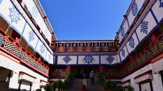 則評價倉姑寺位於林廓南巷,屬於老城區,是當地少有的一座尼姑廟。因當年藏王松贊幹布在此挖洞閉關修行而聲聞天下,是一所具有相當知名度的尼姑廟。倉姑大殿坐北朝南,是一幢三層建築,二、三層為佛堂,寺內主供千手千眼菩薩像,也供放着松贊幹布、寺廟創建者之一的帕崩卡德慶寧布像。倉姑寺較有名的是主佛殿一層地下的松贊幹布修行洞。洞內供奉着藏王松贊幹布的塑像,每天有三名專職的尼姑在這裏,按時誦經祈禱,擺放供品,或是替換燈油。倉姑寺有着與眾不同的傳統和風格,這裏不僅是女性佛者的樂園,同時也是一些社會中的女性們學習佛教、文化和各種知識的場所。甜茶館走進寺廟大門,就是一個很大的露天茶館,甜茶非常好喝也非常有名。茶館裏平時多以當地人為主,近些年遊客也紛紛來此喝茶,感受當地人的生活。倉姑寺寺廟雖然不大,但是乾淨整潔,寺內到處栽植有鮮花,四時不絕。