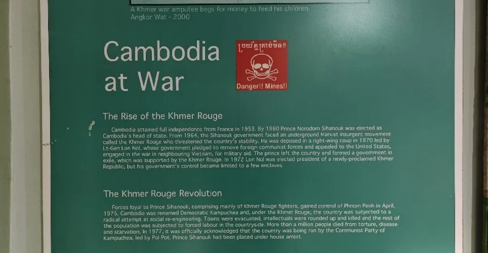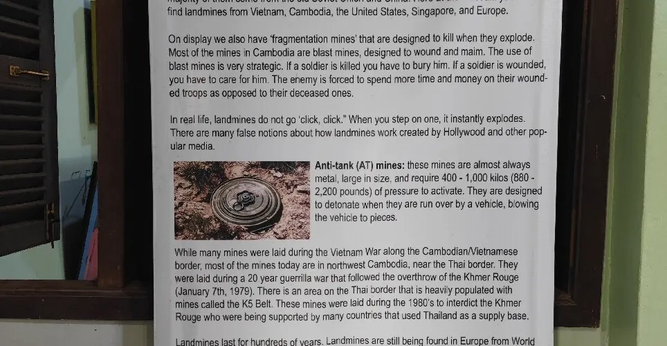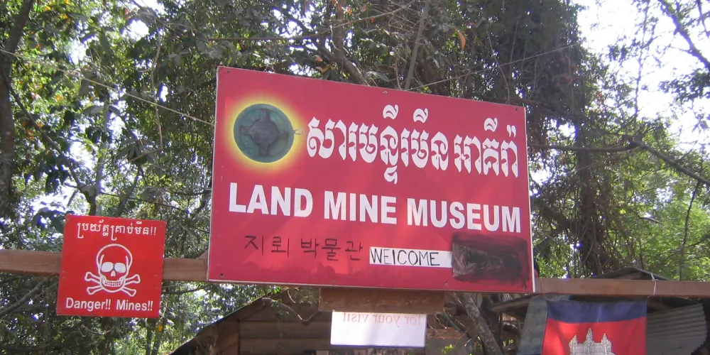 柬埔寨地雷博物館由當地的一個排雷專家阿基•拉(Aki Ra) 建立於1997年,博物館向人們講述地雷的曆史。門票的收入用來支援地雷殘障人士的生活。