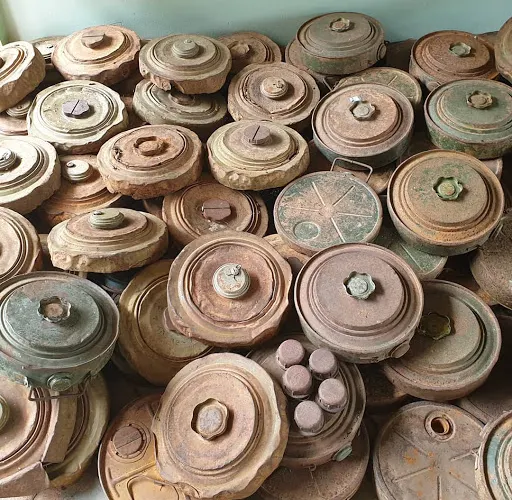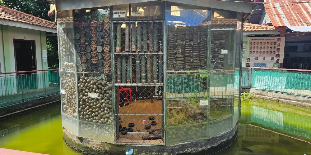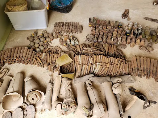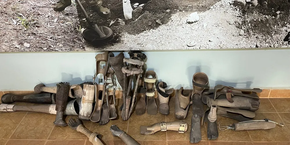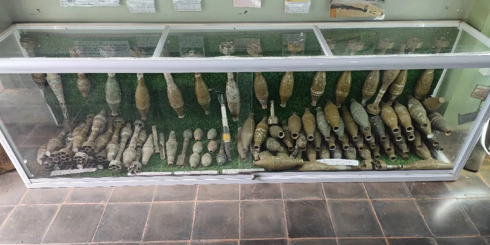 地雷博物館的門口擺放有多個大炮,還有一個地雷亭,小亭子內滿是地雷,大小不一、樣式各異。博物館內還展出用地雷製成的地雷藝術品。除了地雷外,館內還展出有頭盔、迫擊炮、槍支以及內戰時期的各種武器。