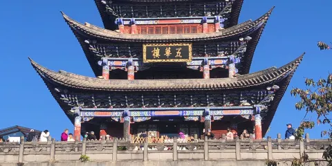 崇聖寺三塔文化旅遊區位於大理古城北1.5公里處,是大理國時期的皇家寺院。這裡東臨洱海,西靠蒼山應樂峰,風景十分優美。三塔原來是崇聖寺的一部分,如今看到的寺院是重建的,而三塔則是已有千年歷史的遺跡,也是來此的很大看點。參觀路線進景區入大門,迎面就能看到位於景區中軸線台階之上的三塔。前方正中的大塔叫千尋塔,與南北兩個小塔呈三足鼎立之勢,頗為大氣。三塔的造型與西安小雁塔相似,拍攝三塔絕妙的地點是它斜後方三塔倒影公園的「三塔聚影池」,在這裡可以拍到三塔和池中的倒影,許多遊客在這裡拍照留念。繞過三塔,沿著中軸線往裡走,沿路可在文物陳列館看維修三塔的過程中發掘出土的南詔、大理國文物,在鐘樓看重達16噸的南詔建極大鐘,在雨銅觀音殿看雨銅觀音,最後便可來到崇聖寺。如今的崇聖寺是2005年重建的,規模宏大,可以感受到當年南詔、大理時期皇家寺院的氣派,寺內各種各樣的龍共1萬多條,是全國龍最多的寺院。另外,寺內還有一面全國很大的牛皮大鼓,直徑3.1米,用一整塊牛皮製成,值得一看。