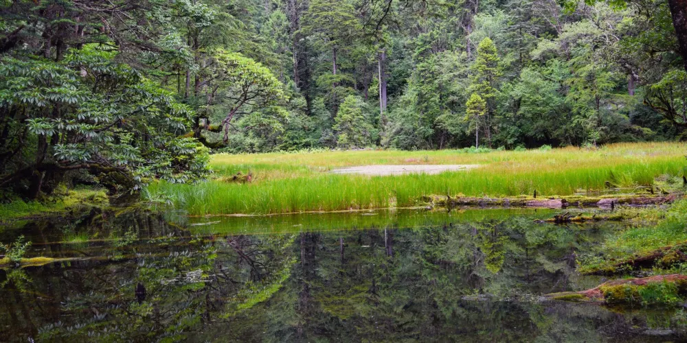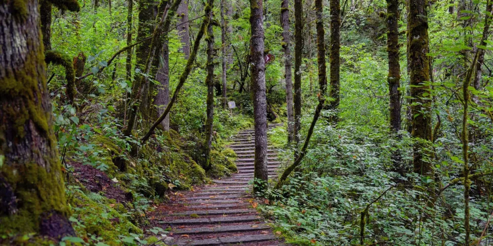 草海子是冰川雨林步遊長廊的入口,位於山地暖温帶針闊葉混交林帶,是一處末次冰期古冰磧湖,其湖面像明鏡鑲嵌在翡翠鏡框之中,湖岸生長着各種珍惜植物,幽靜神祕。叢林因季相變化而五彩繽紛,又被稱為“五花林”。