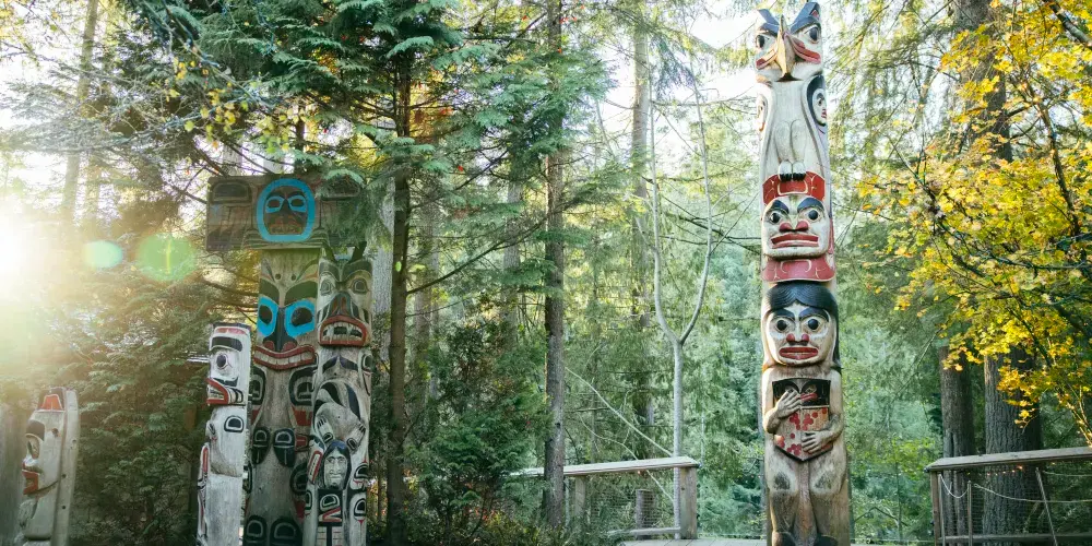 吊橋附近矗立著代表加拿大"第一民族"原住民印第安人文化的圖騰柱,令人駐足。在商店附近的雕刻木屋還能看到印地安雕刻師展現他們的雕刻技巧。
