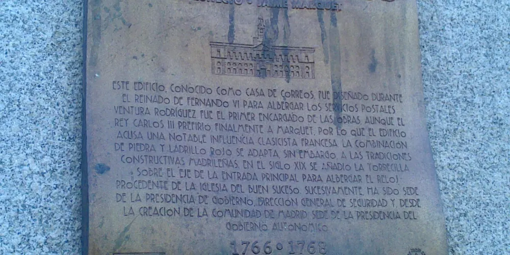 老郵政大樓是太陽門廣場上較突出的建築物,這是一座18世紀末新古典主義風格的宮殿式建築。建成後,曾作為馬德里的中心郵局、陸軍司令部而被使用,如今是馬德里相關部門的辦公所在地。這座太陽門廣場上很古老的建築紅白相間,形似一幢雄偉的宮殿。大樓正中的鐘樓十分有名,每到新年前夕,馬德里人都會彙集於此,在午夜12點鐘聲敲響之際,吃下象徵好運的12顆葡萄,慶祝新年的到來。大樓前面的大道上有一塊知名的“零起點”(KilómetroCero)標誌,被稱為“西班牙的肚臍”。