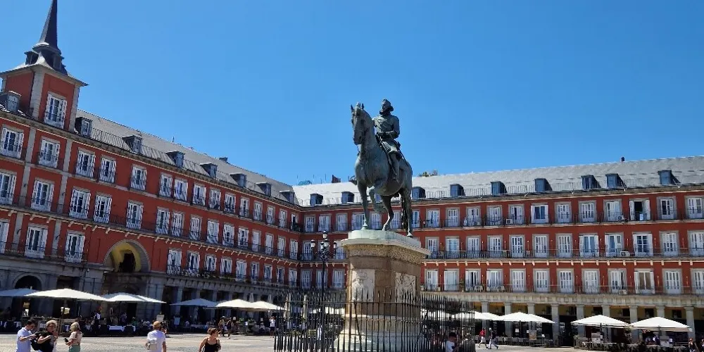 則評價馬約爾廣場在西班牙眾多廣場中尤為出色,長方形包圍式的結構,四周被一列迴廊式古老建築所圍繞,對外的拱門連結著外面的市區街道,立於廣場中心的是主持廣場修建的菲利浦三世國王的騎馬雕像。迴廊內設有露天茶座、紀念品店,非常適合閒逛休息。