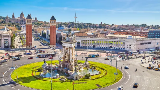 西班牙廣場的地標性建築是一對磚紅色方形柱狀的威尼斯塔,挺拔地矗立於克裡斯蒂娜王后大道兩側,與丘陵上的加泰羅尼亞國家美術館國家宮遙相呼應,布局極具和諧之美。