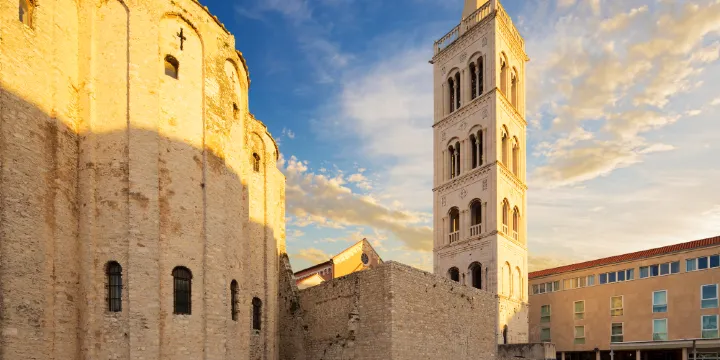 扎達爾主教座堂位於克羅埃西亞扎達爾舊城中心,是天主教扎達爾總教區的主教座堂,也是達爾馬提亞地區規模較大的教堂。其歷史可追溯至西元4-5世紀,原為早期基督教教堂,現存主體建築於12-13世紀重建,融合了羅馬式與哥德式風格。教堂以紅色外觀為特色,高聳的鐘樓於19世紀以新羅馬式風格增建,成為舊城制高點,登頂可俯瞰紅瓦屋頂與亞得里亞海交織的景緻。