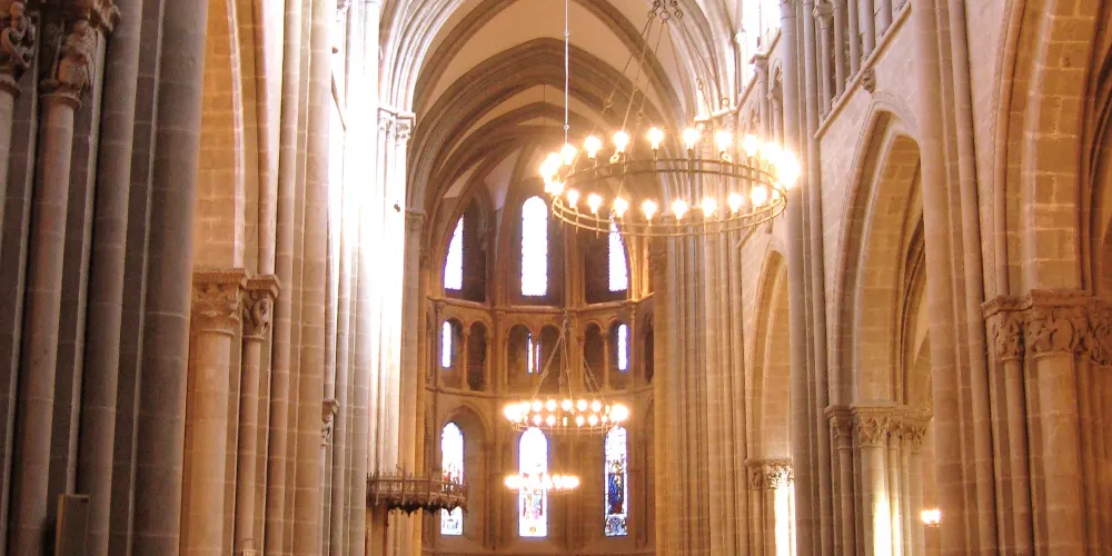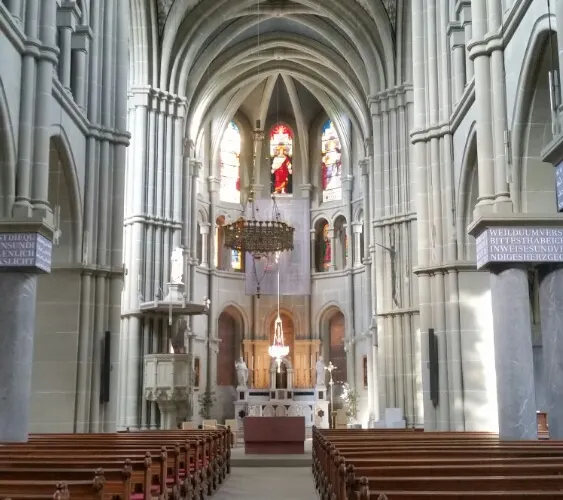 教堂內部的裝飾在新教改革運動中曾遭大面積毀壞,大部分的畫作和雕塑都未能倖免於難,但佈道壇、柱子頂部及穹頂的壁畫還是保存了下來。教堂入口上方有一個大管風琴,現在裡面另安裝了揚聲器,以提供更好地聲學效果。教堂大廳內擺放著長凳和佈道壇,拱頂柱廊上方雕刻著精美的聖徒天使像,吊燈上的蠟燭發散出暖黃色的光,更添朦朧的神聖感。