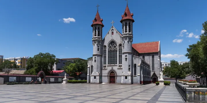 宣化天主教堂:系宣化教區的主教總堂。該教堂坐落於中國河北省張家口市宣化區。清同治八年由樊國樑神父主持修建。康熙二十七年法國耶穌會會士張誠到達宣化傳教。康熙三十八年法國耶穌會會士巴多明在宣化修建了一座天主堂。現在的宣化天主教堂建於1904年;1935年進行過大修,是張家口地區特大的天主教堂。1993年公佈為河北省重點文物保護單位。天主教堂的建築風格為標準的哥特式建築風格,雙鍾尖塔樓,內部為大理石柱和扶壁桁架木石結構,彩繪裝飾簡潔明快,極富濃厚的宗教色彩;其建築規模,可與當時的北京、天津、上海等大城市的聖堂相媲美;教堂所用的青石料,雕刻粗獷,線條明快流暢,就其在建築的宗教內涵,建築學、美學、聲學等方面,都有極高的歷史文化研究價值。