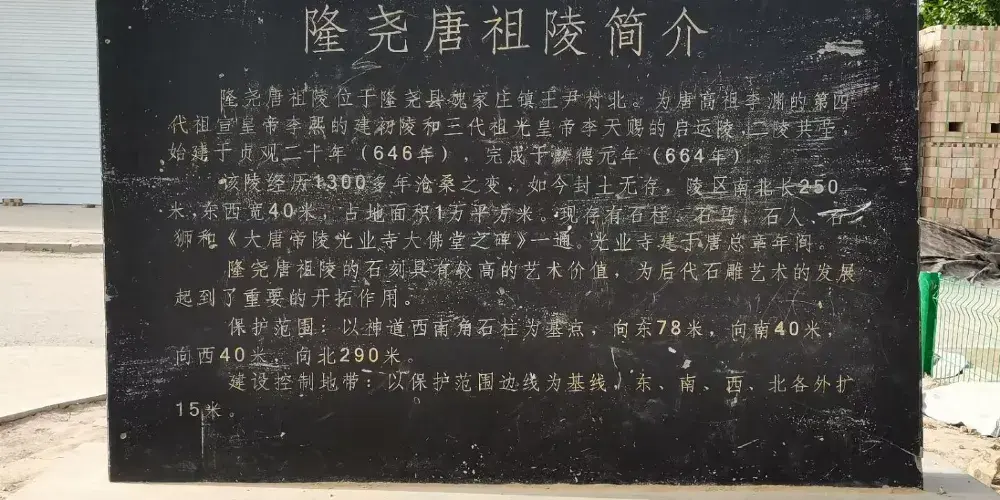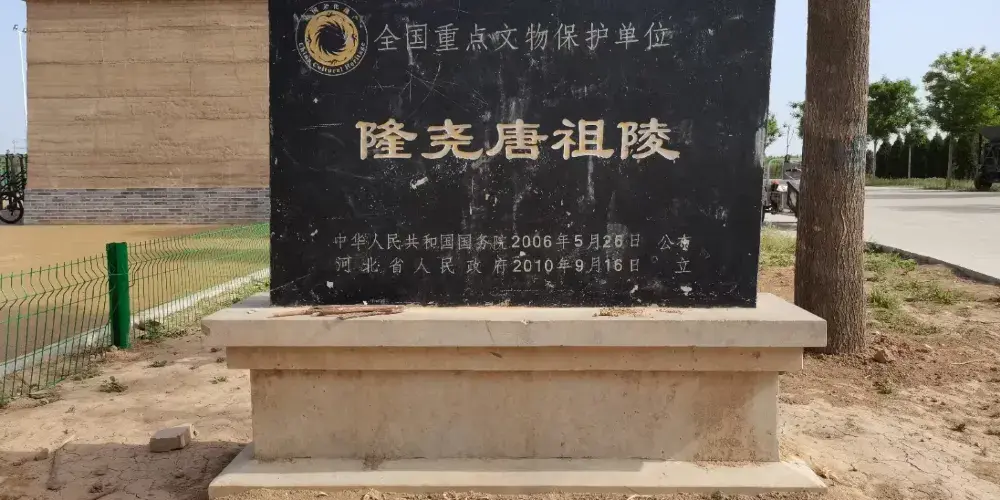 唐陵位於邢台市隆堯縣城正南6公里的魏莊鎮王尹村北200米處,唐陵是唐高祖李淵四代祖宣皇帝李熙的“建初陵”和三代祖光皇帝李天賜的“啟運陵”,二陵共塋,合稱“唐陵”。唐陵於1982年公佈為省級文物保護單位,2006年5月被國務院公佈為第六批全國重點文物保護單位。陵園整個佈局與唐代長安城佈局相似,陵園規制為帝王規格,並且與唐代開國皇帝唐高祖李淵的陵園大小一樣,另外,光業寺碑詳細記載了李唐二祖的生平、追封及建陵建寺之史實,是考證隆堯為李唐祖籍權威的實物證據。由此確認了隆堯唐陵是大唐皇室祖籍所在地。