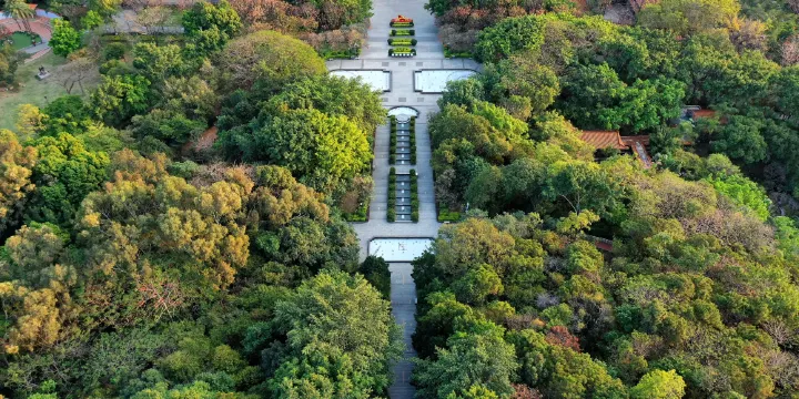 從北入口處踏上台階,展現在眼前的是一片寬闊、平展、面積達兩萬多平方米的廣場,廣場的東西兩側屹立著兩排10米高的大王椰樹及兩排細枼榕,綠樹婆娑,一展南國風采,更添廣場氣勢。往南走,是一座可容納兩千五百觀眾的露天劇場,劇場的外牆是一幅百多米長的浮雕,藝術地再現了長安過去的曆史,改革開放後的輝煌成就,以及展示美好的未來。