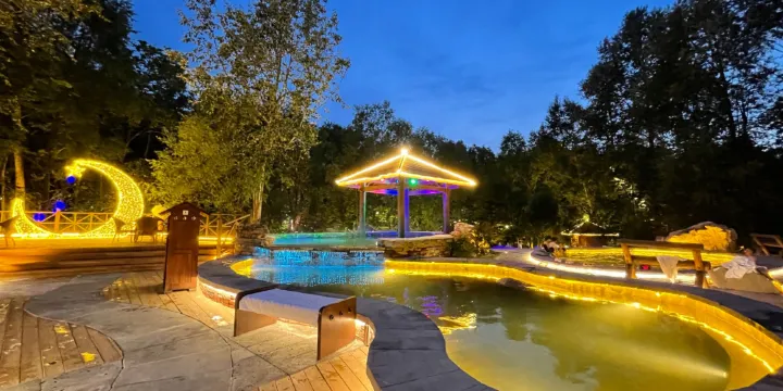 室內場所服務設施一應俱全。室外景觀涵蓋區域近7000㎡,在原有天然河道及建築之間設定各類特色温泉池,及室外客人休息室,分佈在林間及河道之間,結合地勢及樹木植,周邊相應制作木平台和景觀亭。其他區域設有木棧道、木亭台廊架等,整體材質大多彰顯地方特色,景觀處理上追求原始、自然。更因温泉水質情況,榮登中國十大温泉。