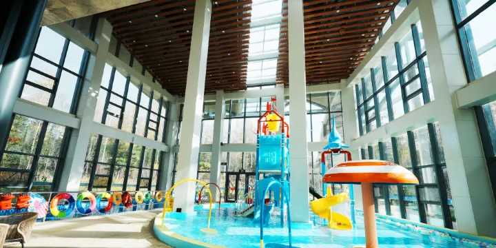東南側提供功能產全的温泉小童樂水上樂園項目適合親子戲水、夏令營等相關活動,西南側共浴區提供多功能泡池和休閑區;
