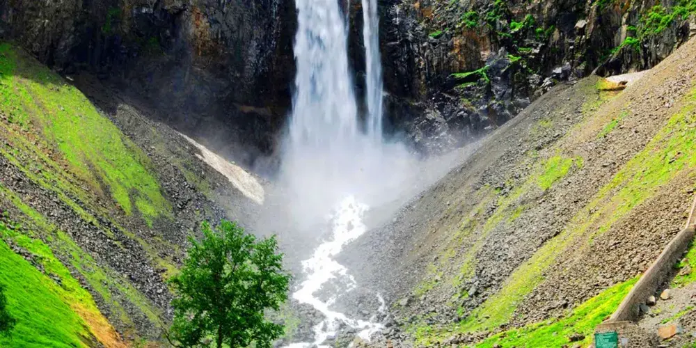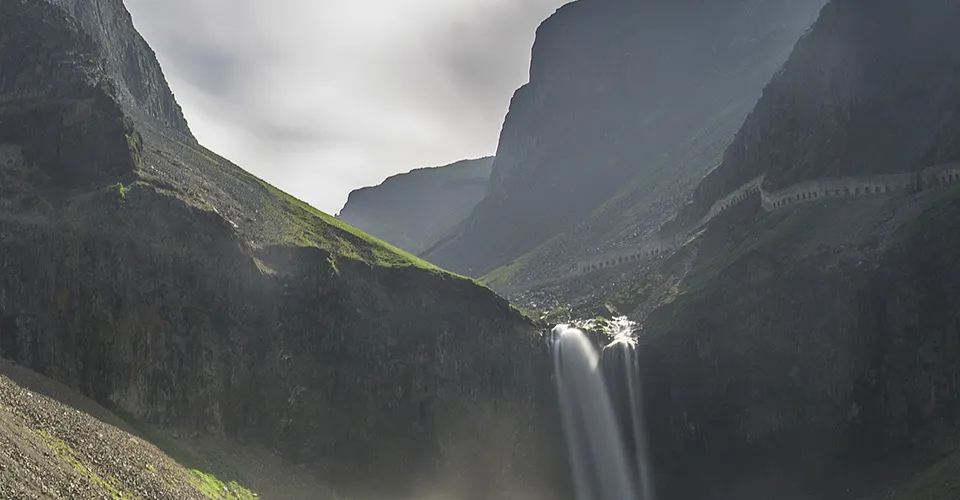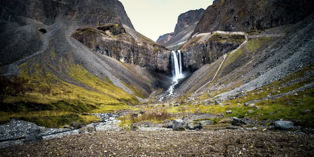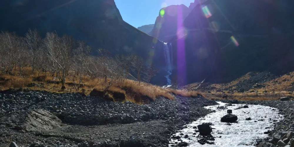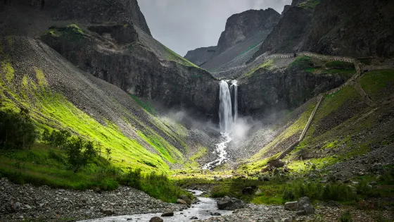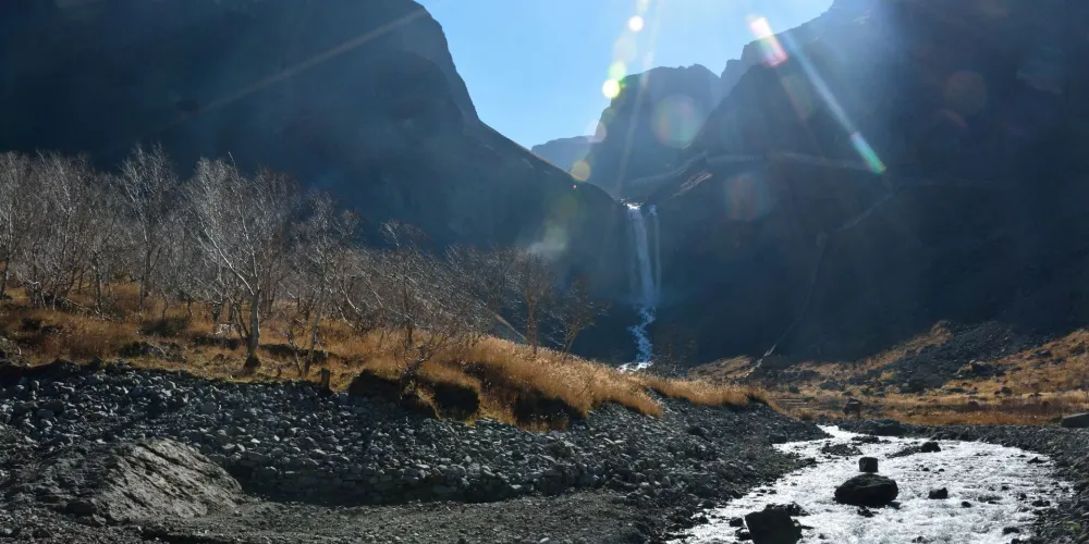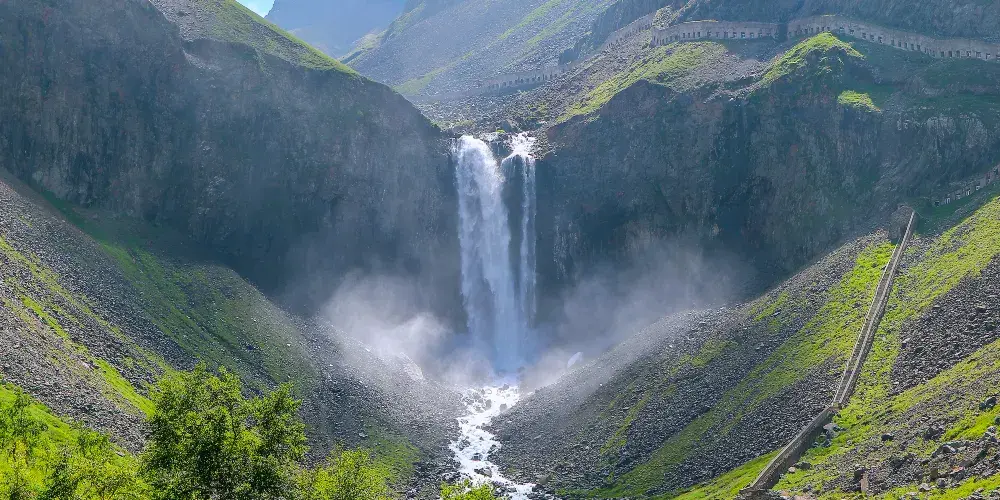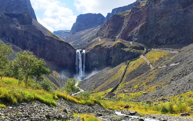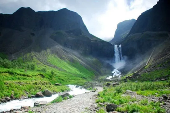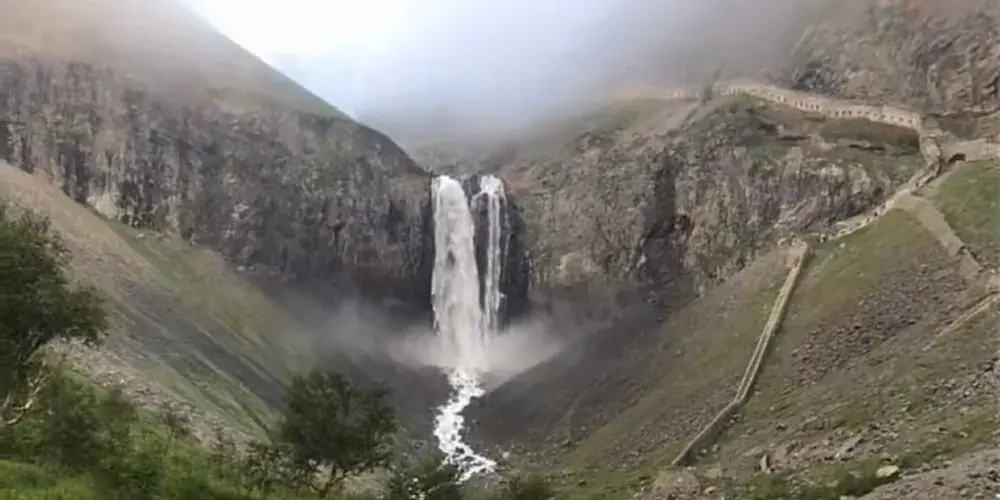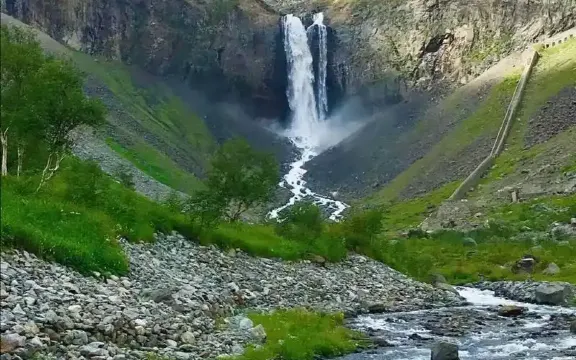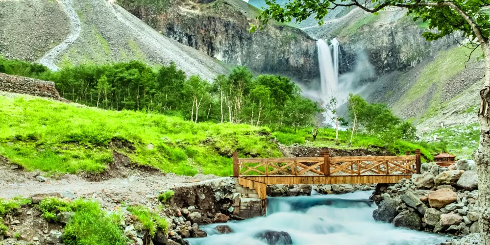 長白山天池北面有一個小缺口,湖水由此溢出一瀉而下,形成了長白瀑布,匯入二道白河,即松花江正源。站在瀑布前的觀景台遠觀瀑布,只見水流好像從天而降。由於山大坡陡,水勢湍急,瀑布像一架斜立的天梯。瀑布口有一巨石叫“牛郎渡”,將瀑布分為兩股。兩條玉龍似的水柱勇猛的撲向突起的石灘,沖向深深的谷地,濺起幾丈高的飛浪,水氣瀰漫好似霧氣。