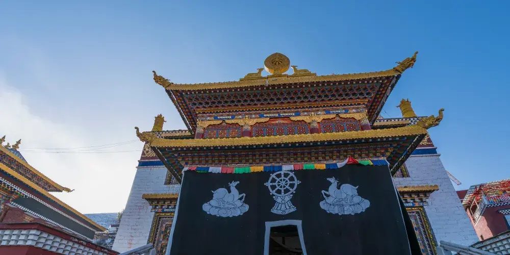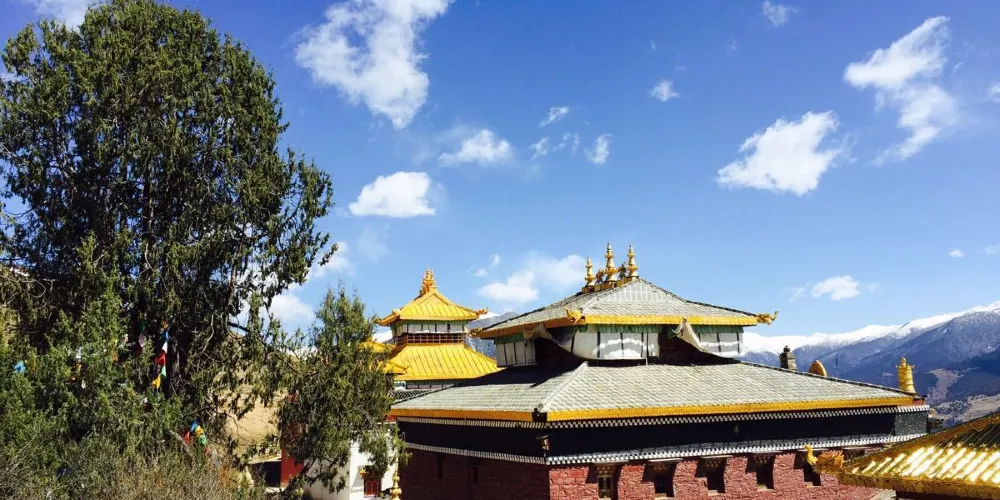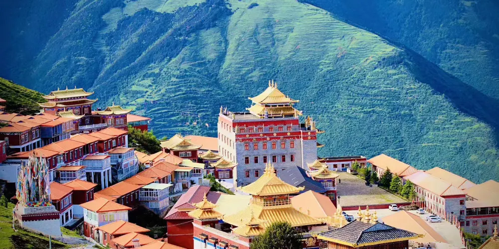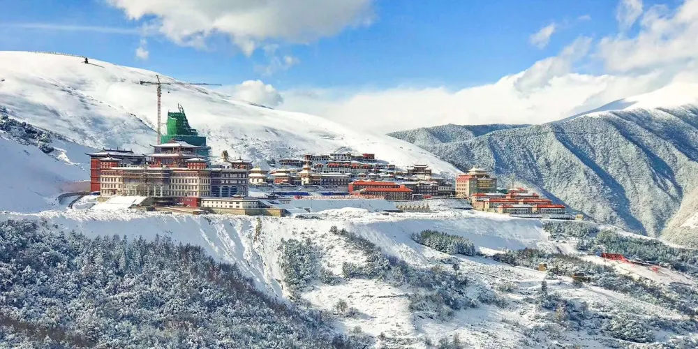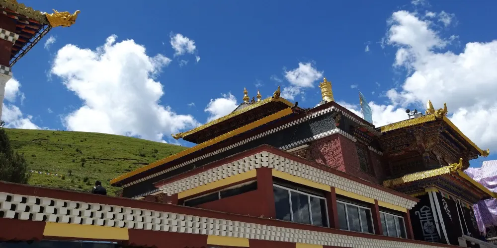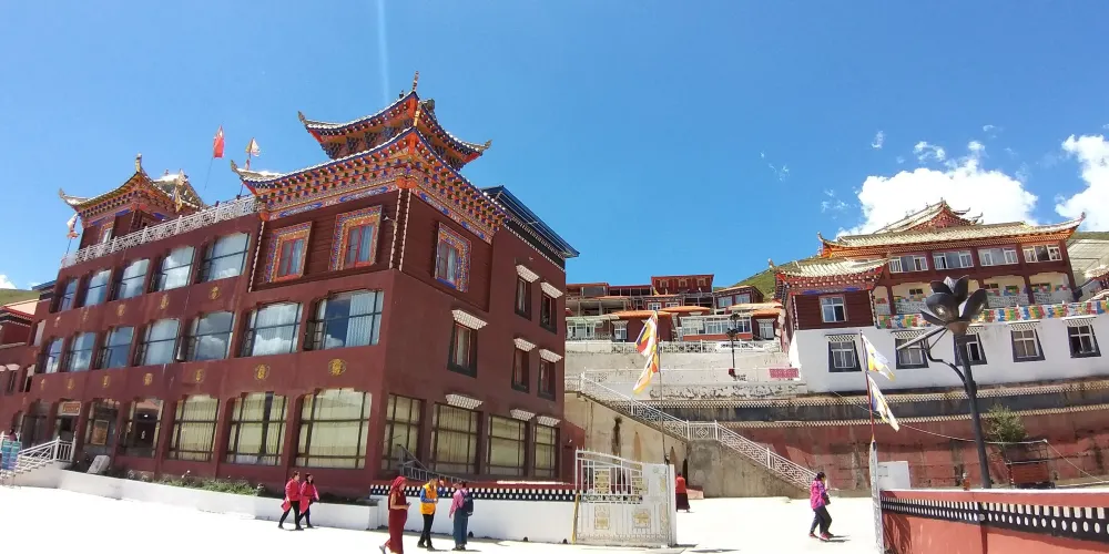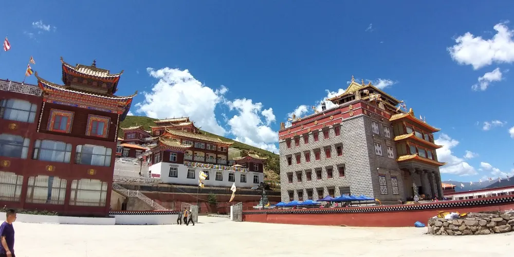 新寺院是由高達六層的寺院主樓、四棟僧侶宿舍樓、寺院賓館和遊人接待室等構成。寺院主樓一樓為大經堂、二樓為講經堂、三樓為藏經樓、四樓為多媒體電教室、五樓為金佛殿、六樓為陳列館,樓頂為金頂。寺院地勢開闊,環境優美,有雪山、高山草甸、原始森林。